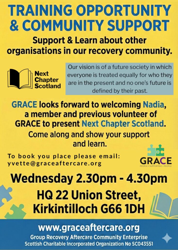 GRACE looks forward to welcoming Nadia a member and previous volunteer of GRACE to present Next Chapter Scotland come along and show your support and learn about this organisation